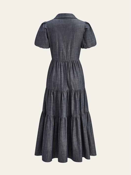 Puf Kollu Katlı Önü Düğmeli Maksi Elbise