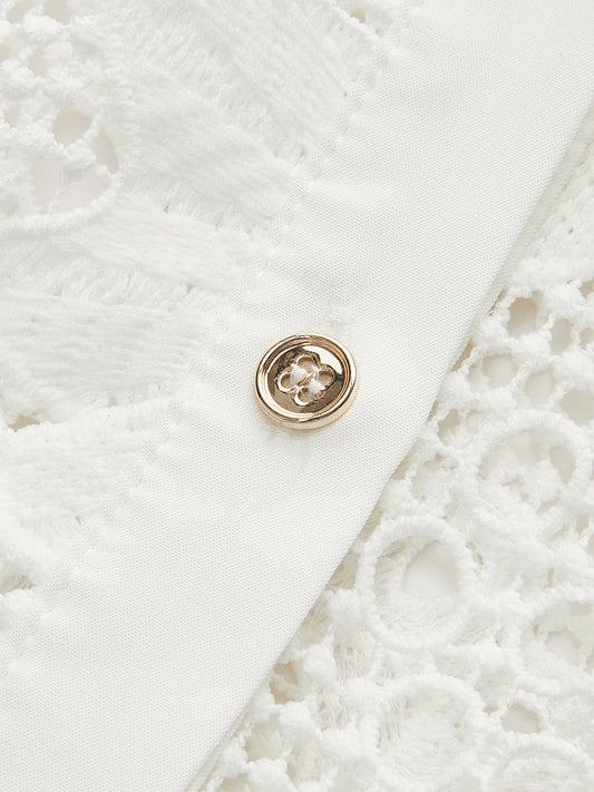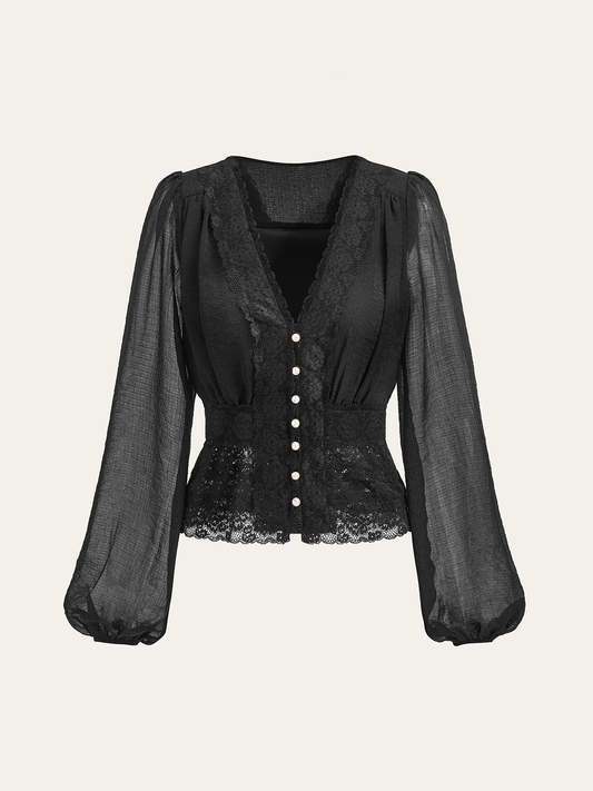 Yarı Şeffaf Dantel Kenarlı İnci Düğmeli Üst