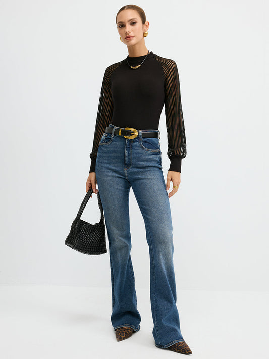 Balıkçı Yaka Şeffaf Panel Örgü Üst