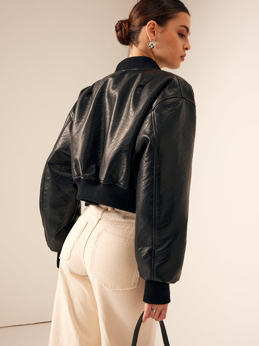 Fermuarlı Cepli PU Deri Kısa Ceket