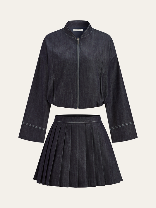 Fermuarlı Ön Ceket ve Pileli Mini Etek Takımı