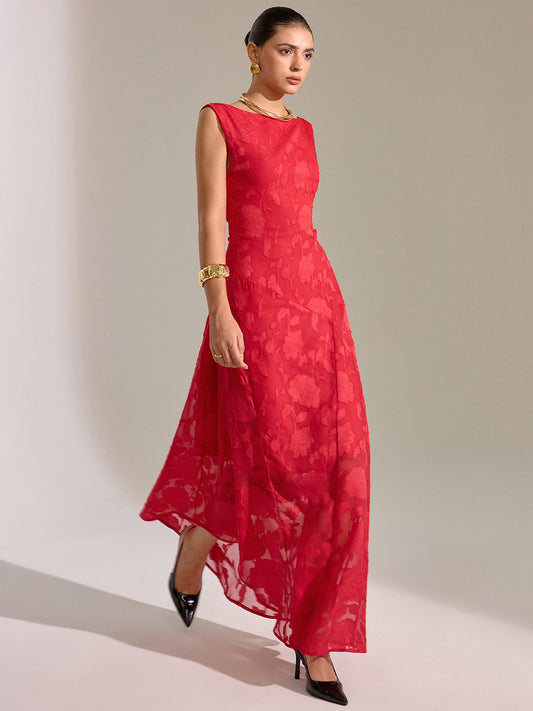 Çiçekli Jakarlı Kolsuz Uzun Elbise