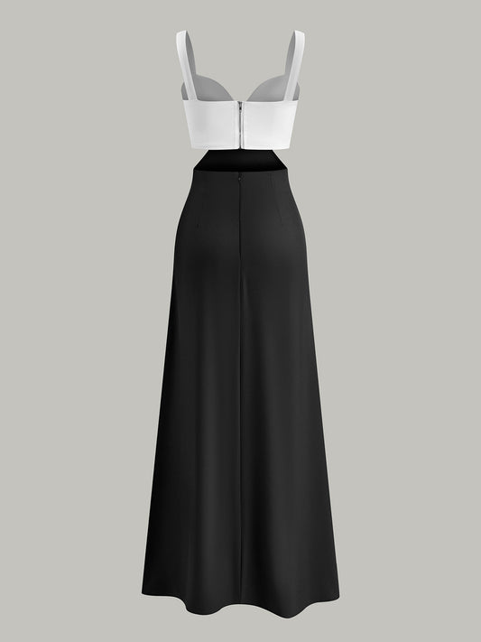 Renk Bloklu Straplez Katmanlı Uzun Elbise
