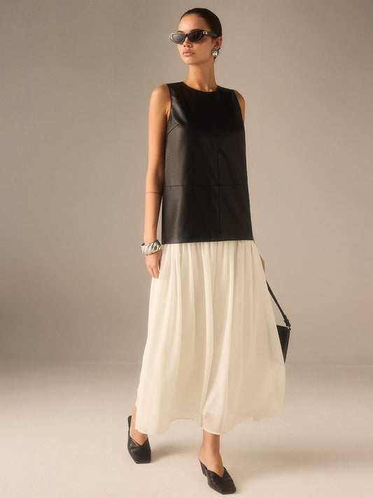 İki Renkli Suni Deri Şifon Pileli Elbise