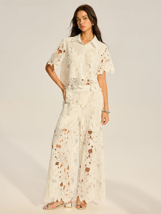 Dantel Tığ İşi Kesik Üst ve Geniş Paça Pantolon Takımı