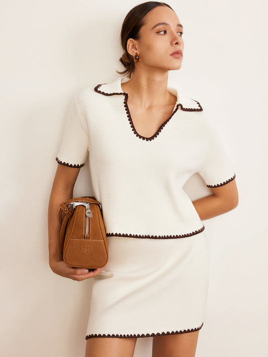 Kontrast Kesimli Kavisli Hırka ve Uyumlu Pileli Mini Etek