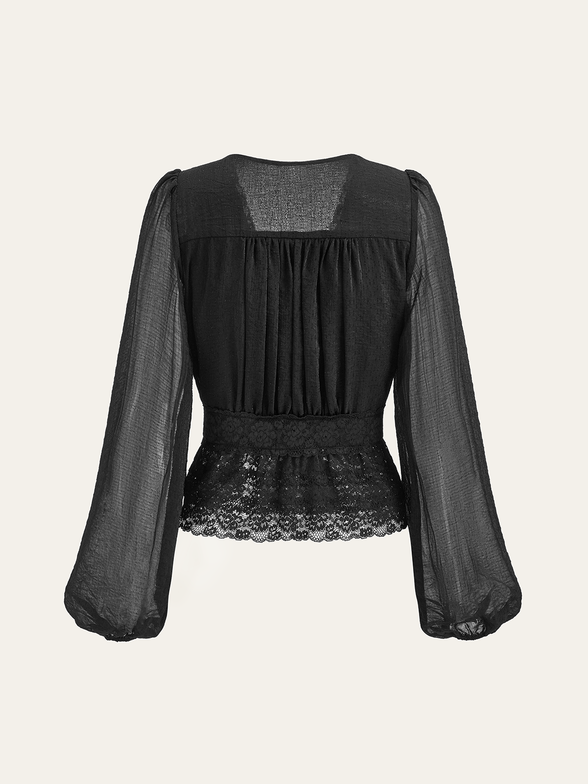 Yarı Şeffaf Dantel Kenarlı İnci Düğmeli Üst