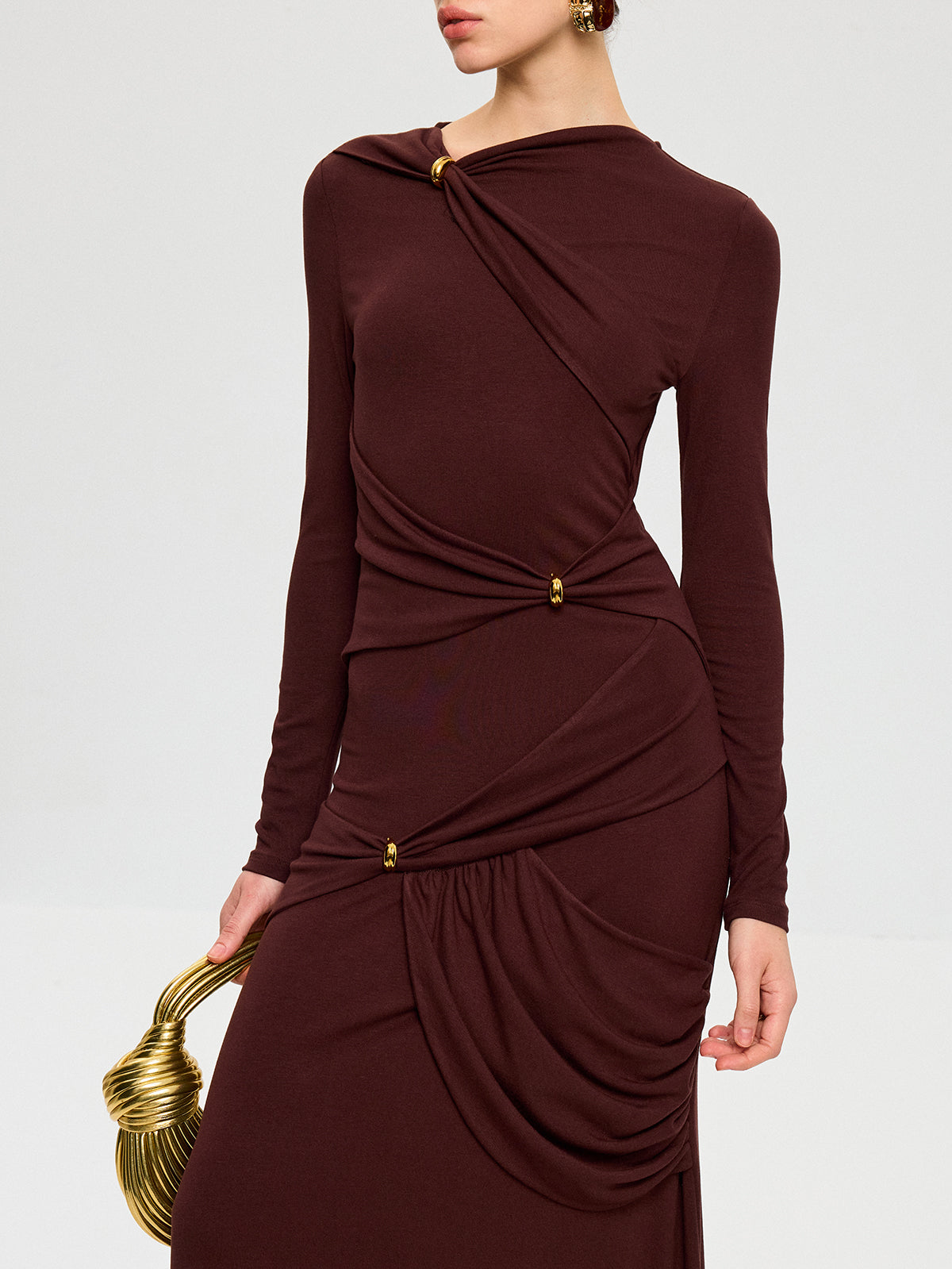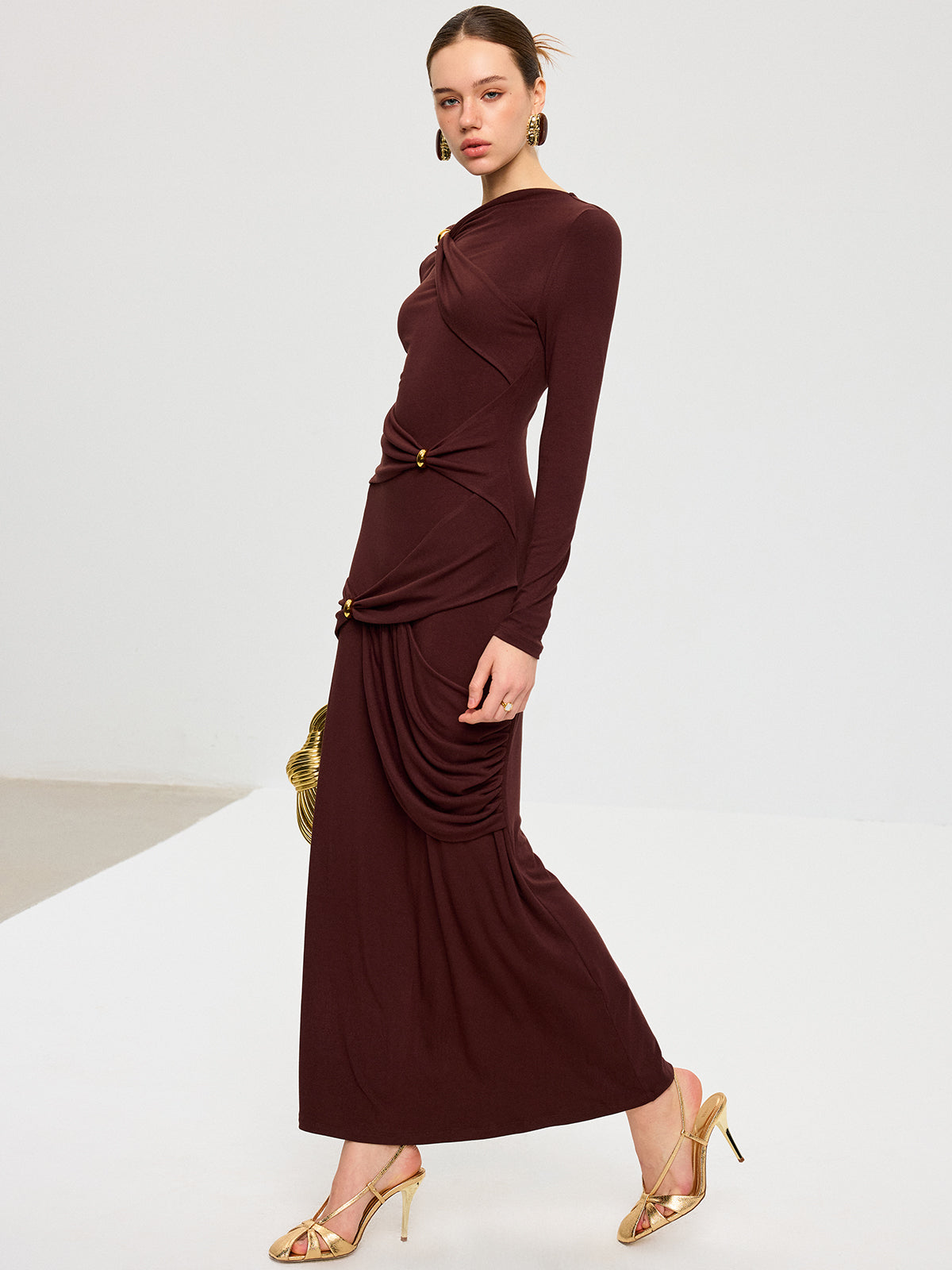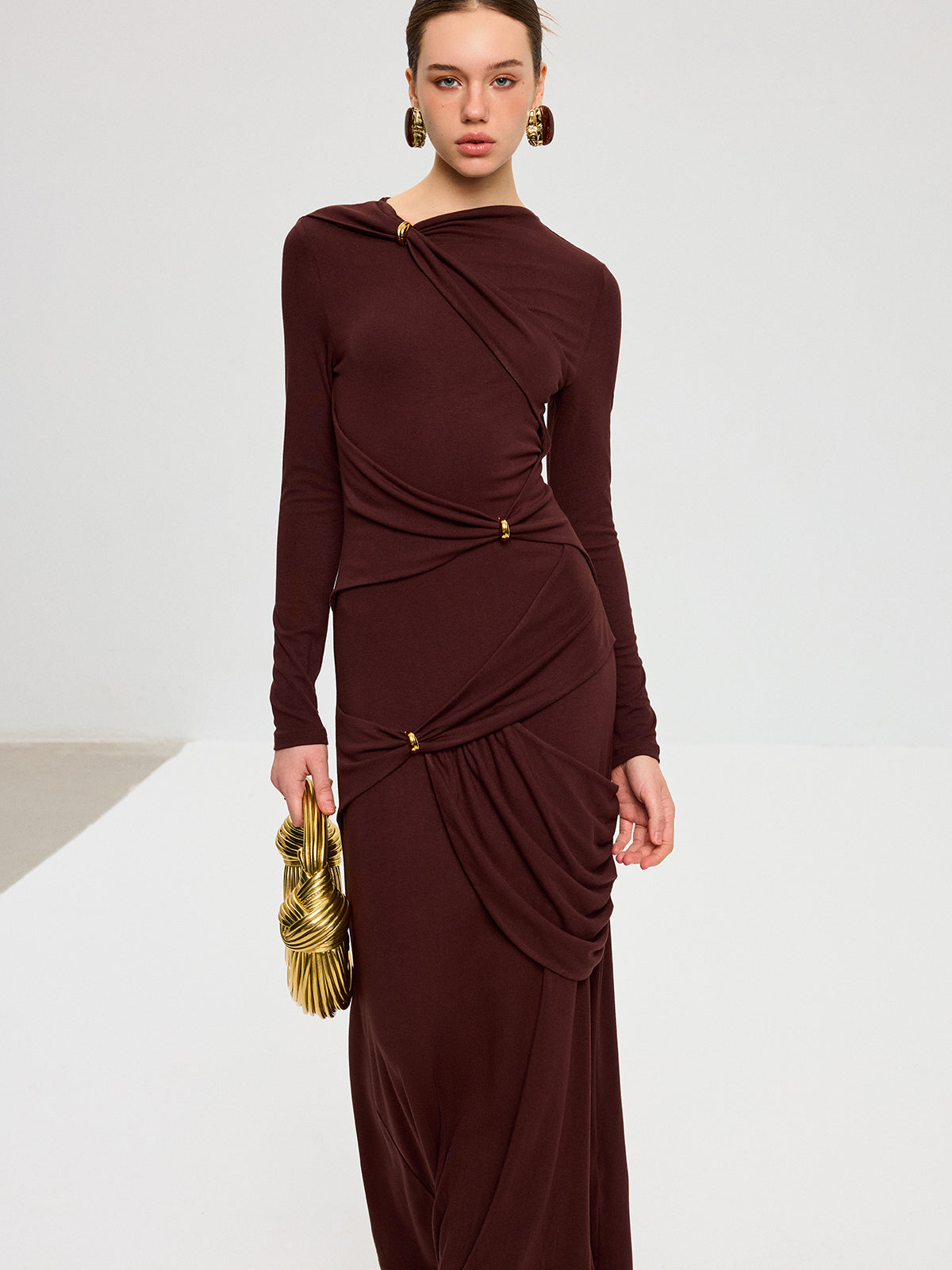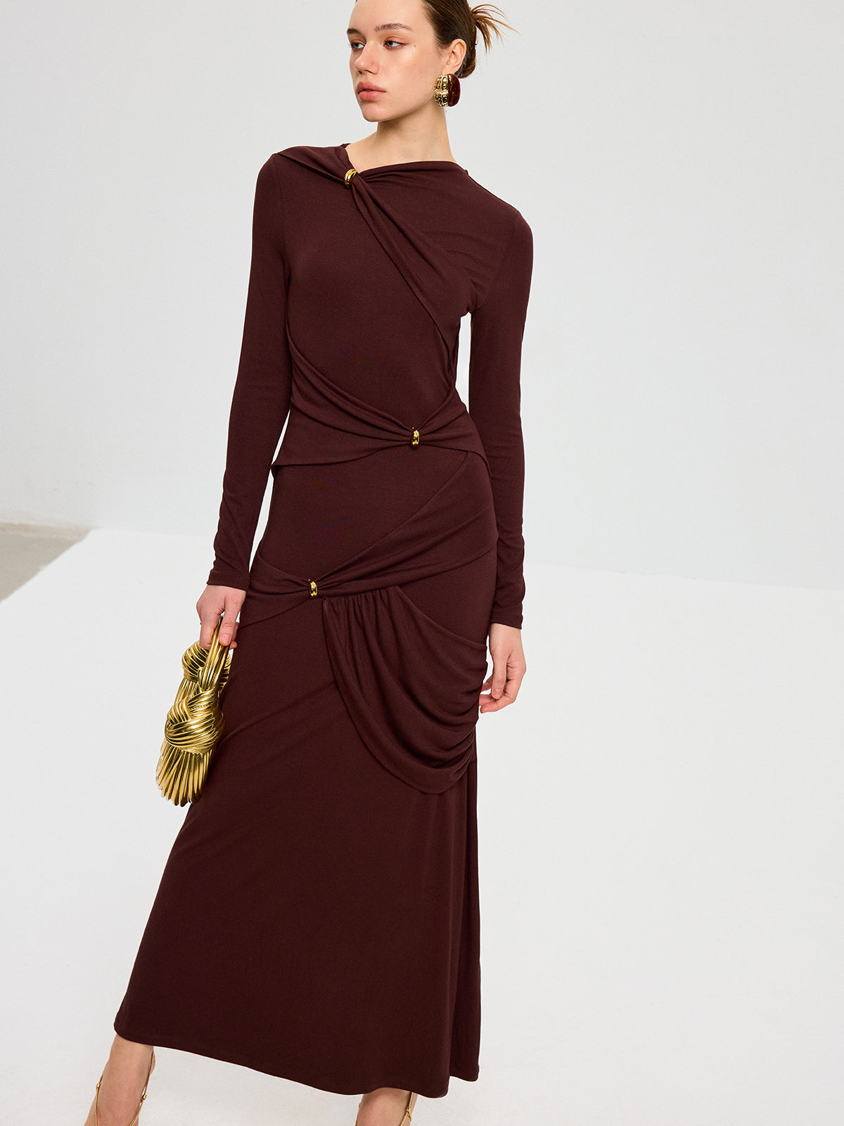 Metal Detaylı Uzun Kollu Drapeli Maksi Elbise