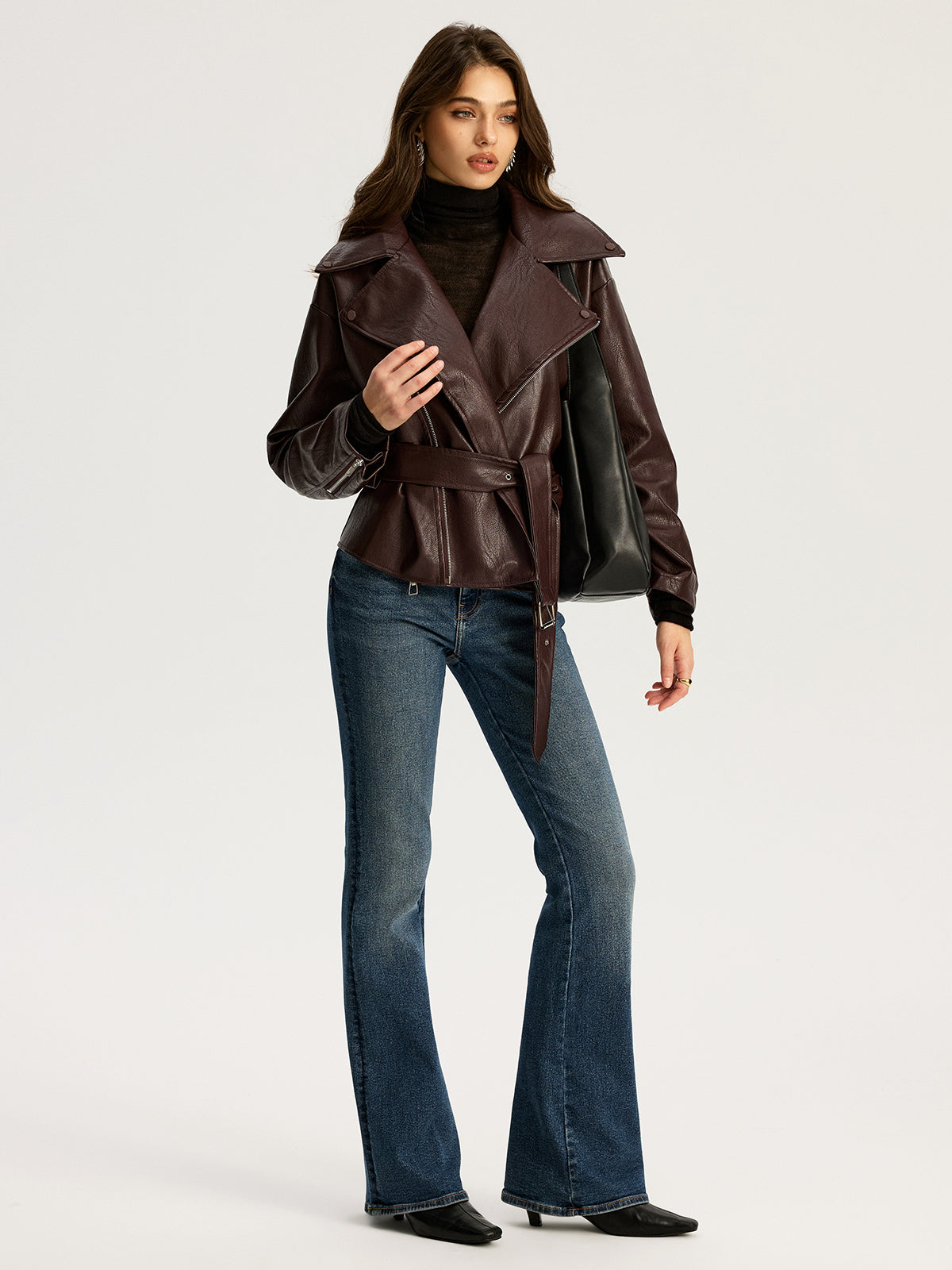 Fermuarlı Ön Kemerli Suni Deri Ceket